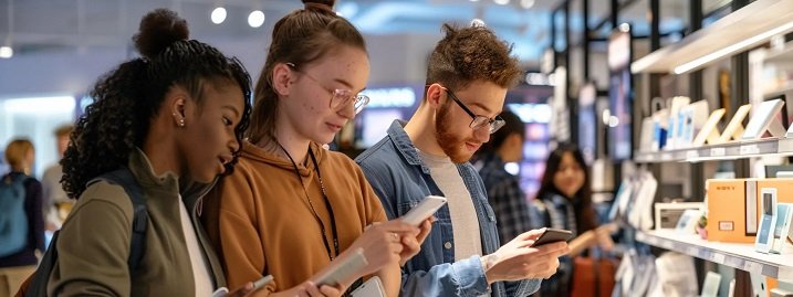 Alt text: Friends shopping together and using a phone in a store that offers a personalized shopping experience by using a customer segmentation program.